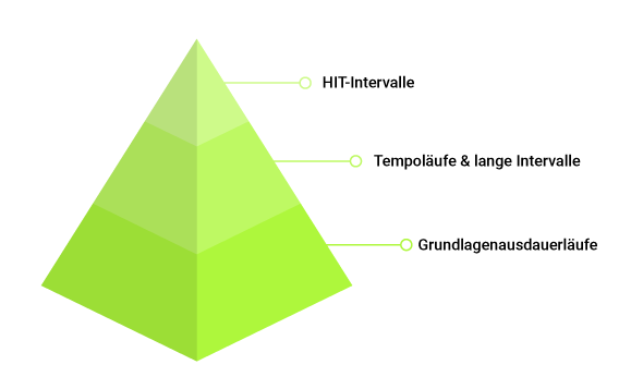 Die Trainingsbausteine kannst Du dir vorstellen wie eine Pyramide. Die Basis, und damit der größte und wichtigste Stein, bildet die Grundlagenausdauer. Den zweiten Baustein bilden Tempoläufe, und Intervallläufe mit langen Intervallen zwischen 2 und 10 Minuten. Die spitze der Pyramide besteht aus HIT- Intervallen (High Intesity Training), also kurze Intervalle mit hoher Intensität (35s-2min).