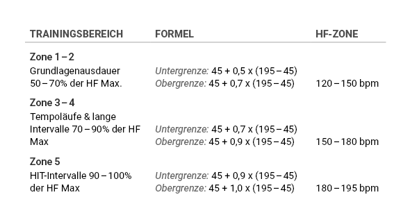 Um die Intensität zu steuern, werden Herzfrequenzzonen festgelegt. Das heißt, der Puls sollte sich in einem definierten Bereich bewegen. An der Stelle sei erwähnt, dass der Puls vielen individuellen Faktoren unterliegt, darunter Alter, Größe, Geschlecht und sportliche Vorerfahrung. Zusätzlich ist der Puls tagesformabhängig. Die Formel für die HF-Zonen gilt als Richtwert und Empfehlung.